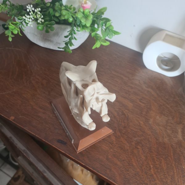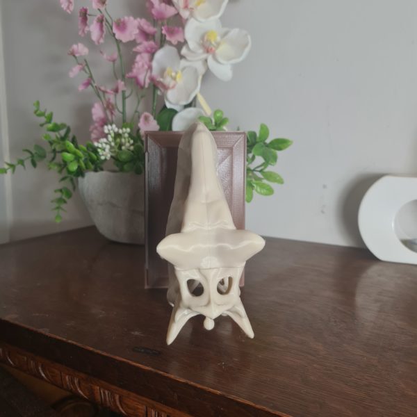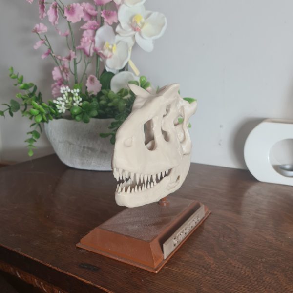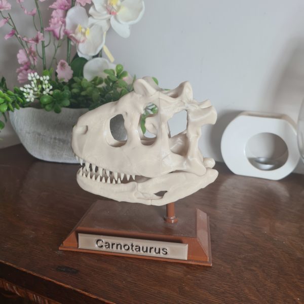 Ce crane dinosaure carnotaurus reprend les volumes essentiels visibles sur de nombreux fossiles connus : museau allongé, ouvertures latérales marquées, dents fines et rangées, ainsi que la structure générale du haut du crâne. La forme globale reste volontairement épurée pour obtenir un rendu propre et agréable à exposer.