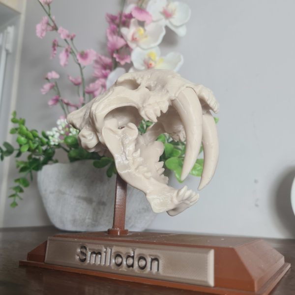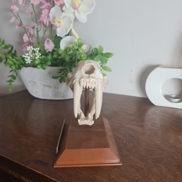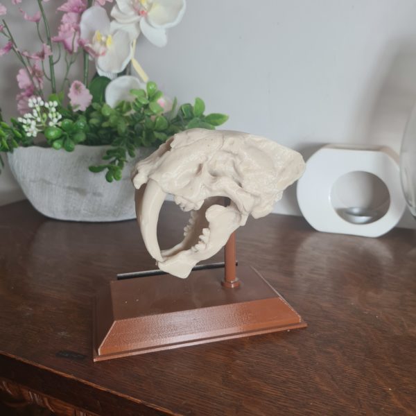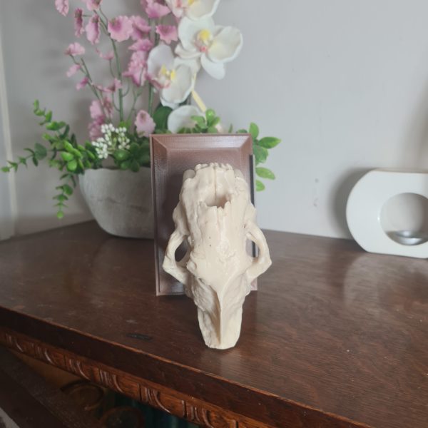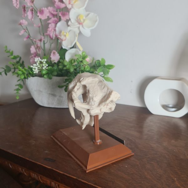 Ce crâne reprend les éléments morphologiques essentiels de l’animal : les canines allongées, la mâchoire large, les contours robustes et la structure reconnaissable. Les volumes offrent un rendu propre, stable et facile à exposer. Le socle assure une bonne tenue et confère au crâne une hauteur adaptée pour une présentation nette et sobre.