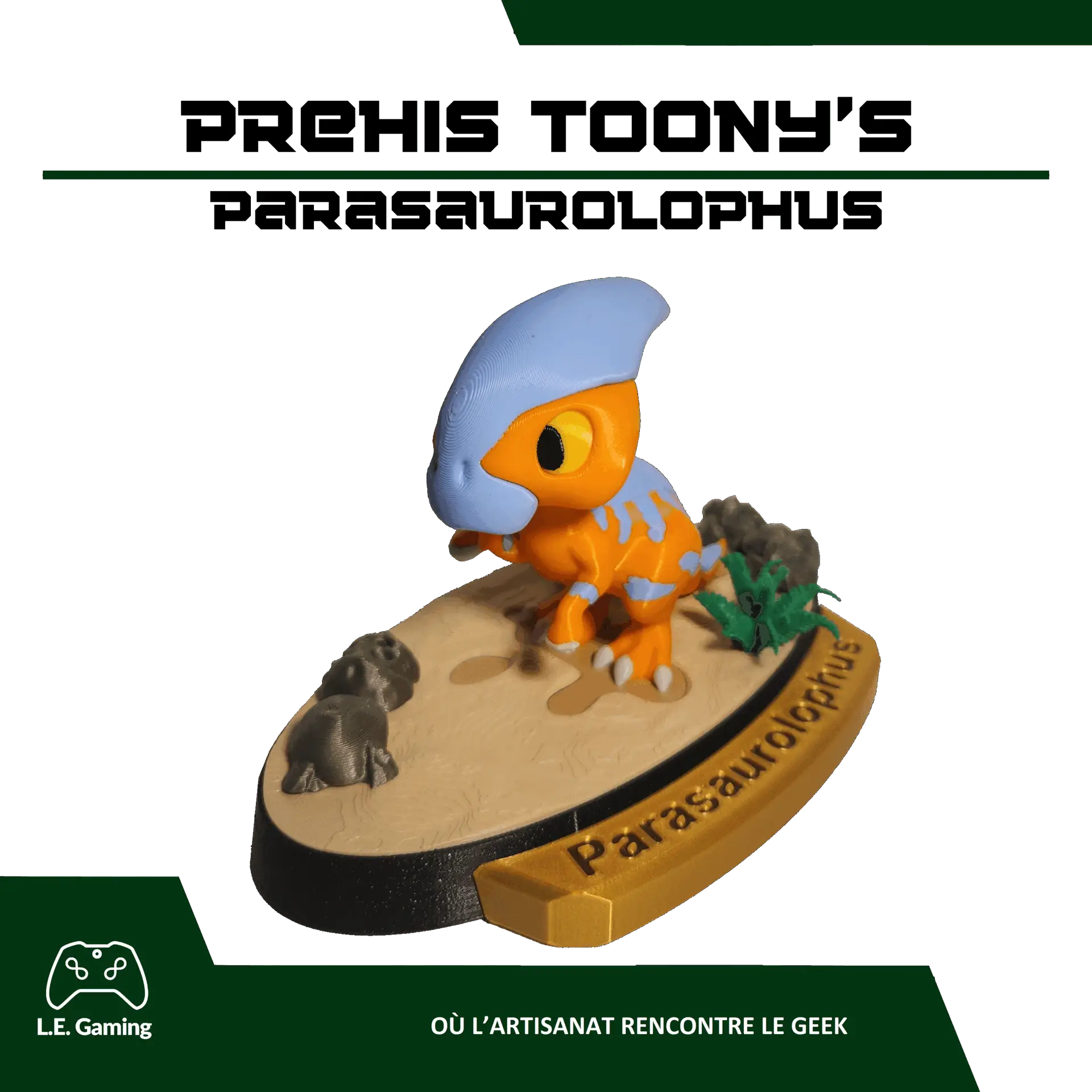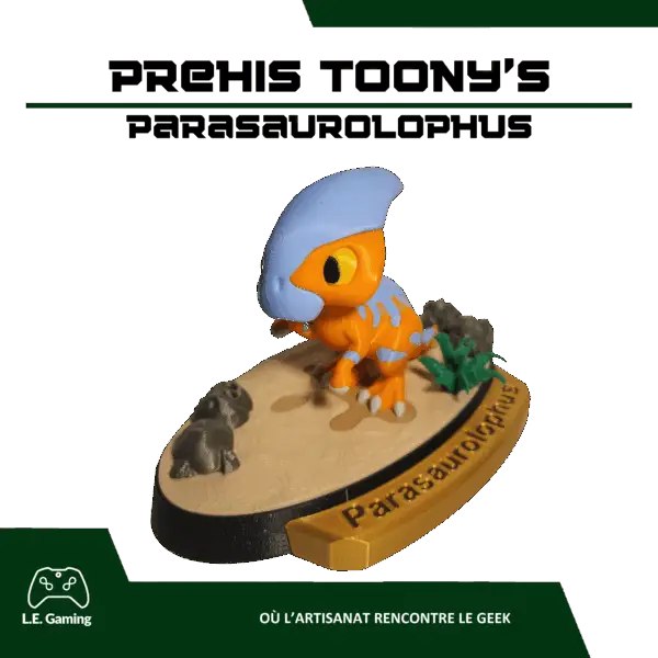 Imprimées en 3D dans notre atelier des Vosges, les figurines Prehis Toony’s sont réalisées en PLA teinté dans la masse, un matériau biosourcé et robuste, sélectionné pour son rendu net, précis et durable.