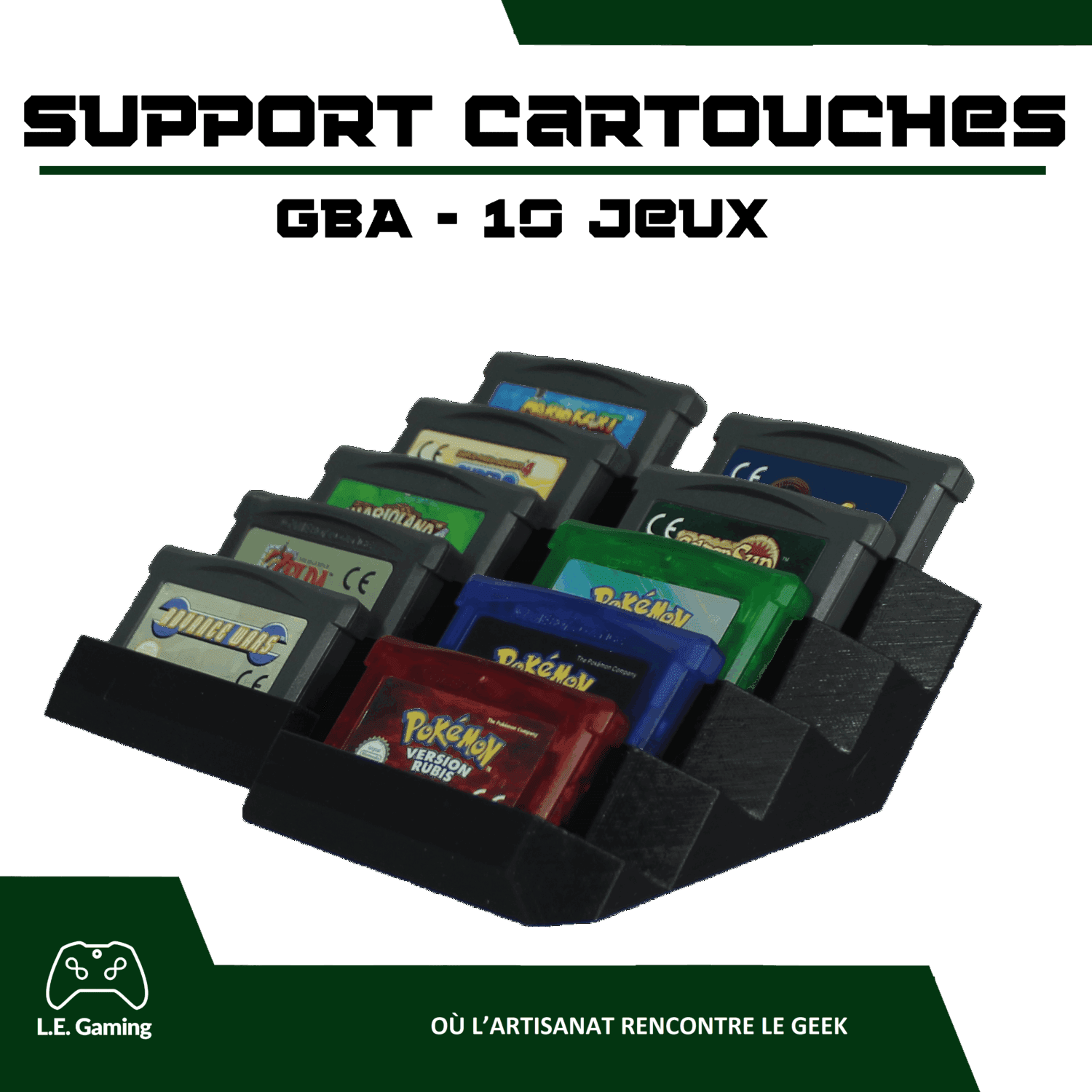 Le support 10 cartouches GBA L.E. GAMING 88 permet d’organiser et de présenter dix jeux Game Boy Advance dans un espace gaming ou une vitrine de collection. Une fois les cartouches installées, elles restent visibles, alignées et faciles d’accès, ce qui améliore la lisibilité de la collection.