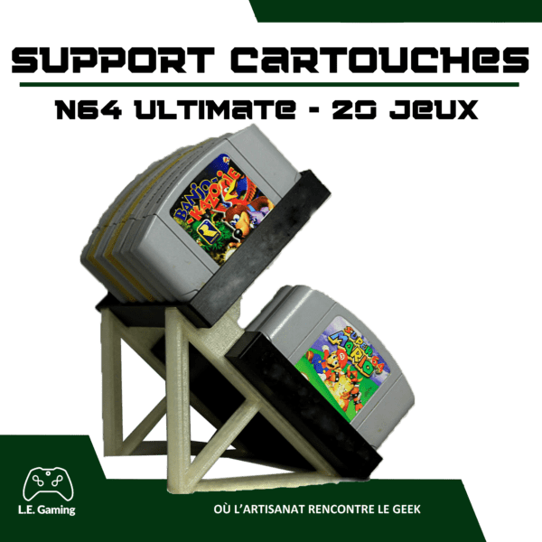 Le support 20 cartouches N64 L.E. GAMING 88 a été imaginé pour offrir un rangement clair, élégant et durable à tous les passionnés de jeux Nintendo 64. Pensé comme un accessoire fonctionnel autant qu’un élément décoratif, il permet de mettre en avant tes jeux emblématiques tout en assurant un maintien stable et organisé.