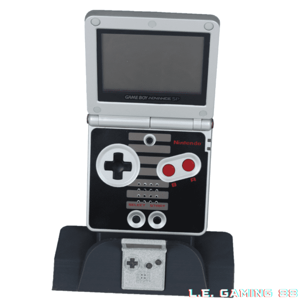Ce support console Gameboy Advance SP offre une présentation inclinée qui met en avant la forme caractéristique de la console, ouverte comme fermée. De plus, il assure une tenue stable sans masquer les détails du design. Grâce à son format compact, il s’intègre facilement dans une vitrine, sur un bureau ou sur une étagère. Ensuite, son style sobre reste compatible avec toutes les éditions SP, qu’elles soient classiques ou spéciales.